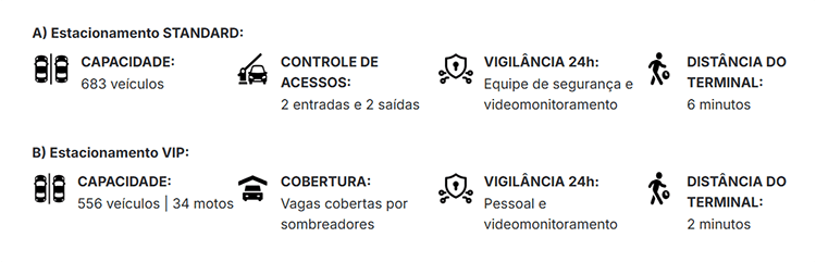 Já o Estacionamento VIP oferece maior comodidade, com vagas mais próximas ao terminal, ideal para quem busca rapidez e praticidade.